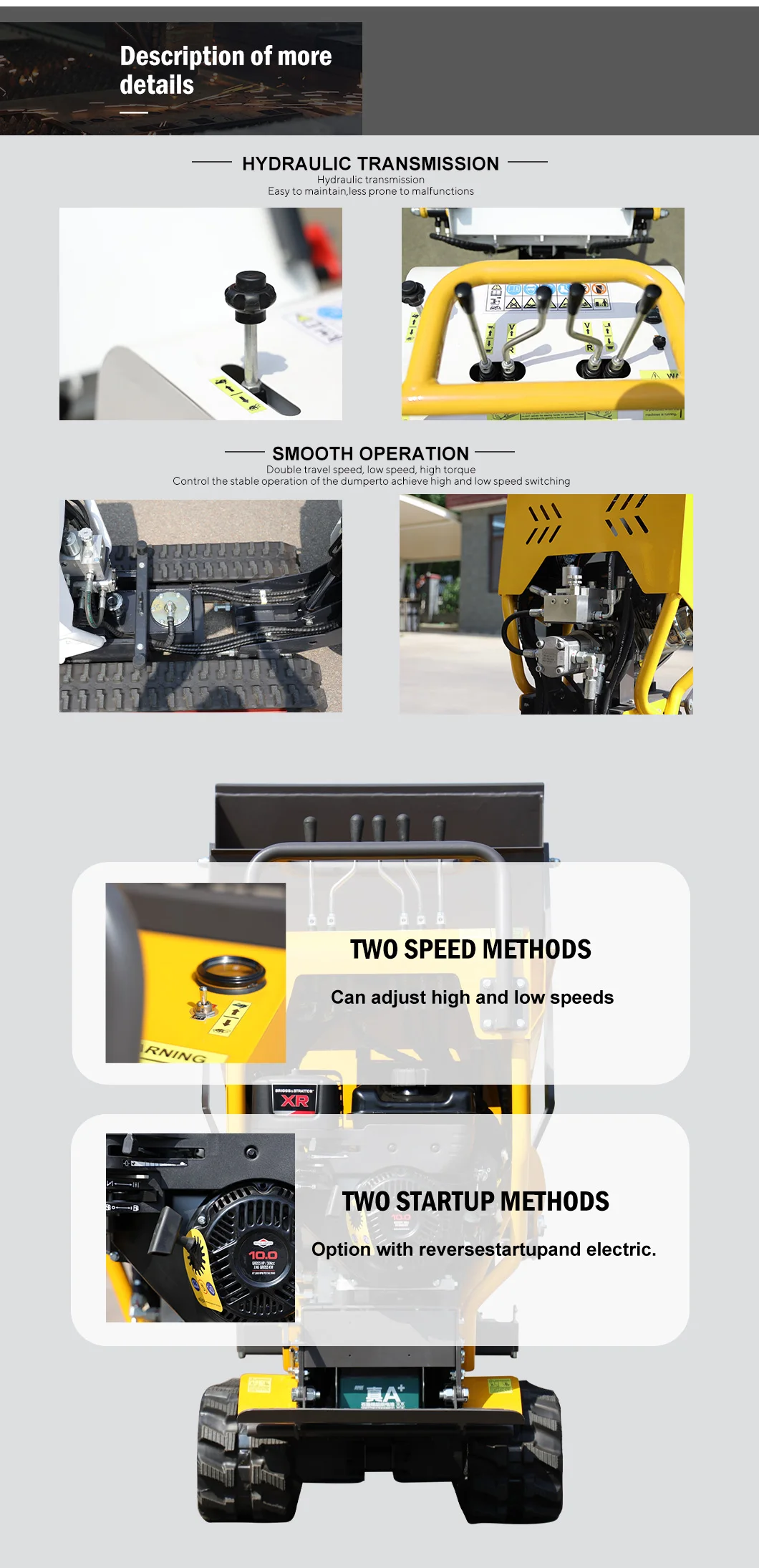 SPECIFICATIONSApplicable Industries: HOME USEBrand Name: huayeeCertification: CE,EPA,ISOCondition: NewCore Components: ENGINEEngine Brand: Briggs & StrattonHign-concerned Chemical: NoneKey Selling Points: AutomaticMachinery Test Report: ProvidedOrigin: Mainland ChinaPlace Of Origin: chinaRated Power: 15HPShowroom Location: CHINAType: Crawler TractorVideo outgoing-inspection: ProvidedWarranty: 1 yearsWarranty of Core Components: 1 YearYear: 2024 Hot Product Cheap Mini Truck Transporter Hydraulic...